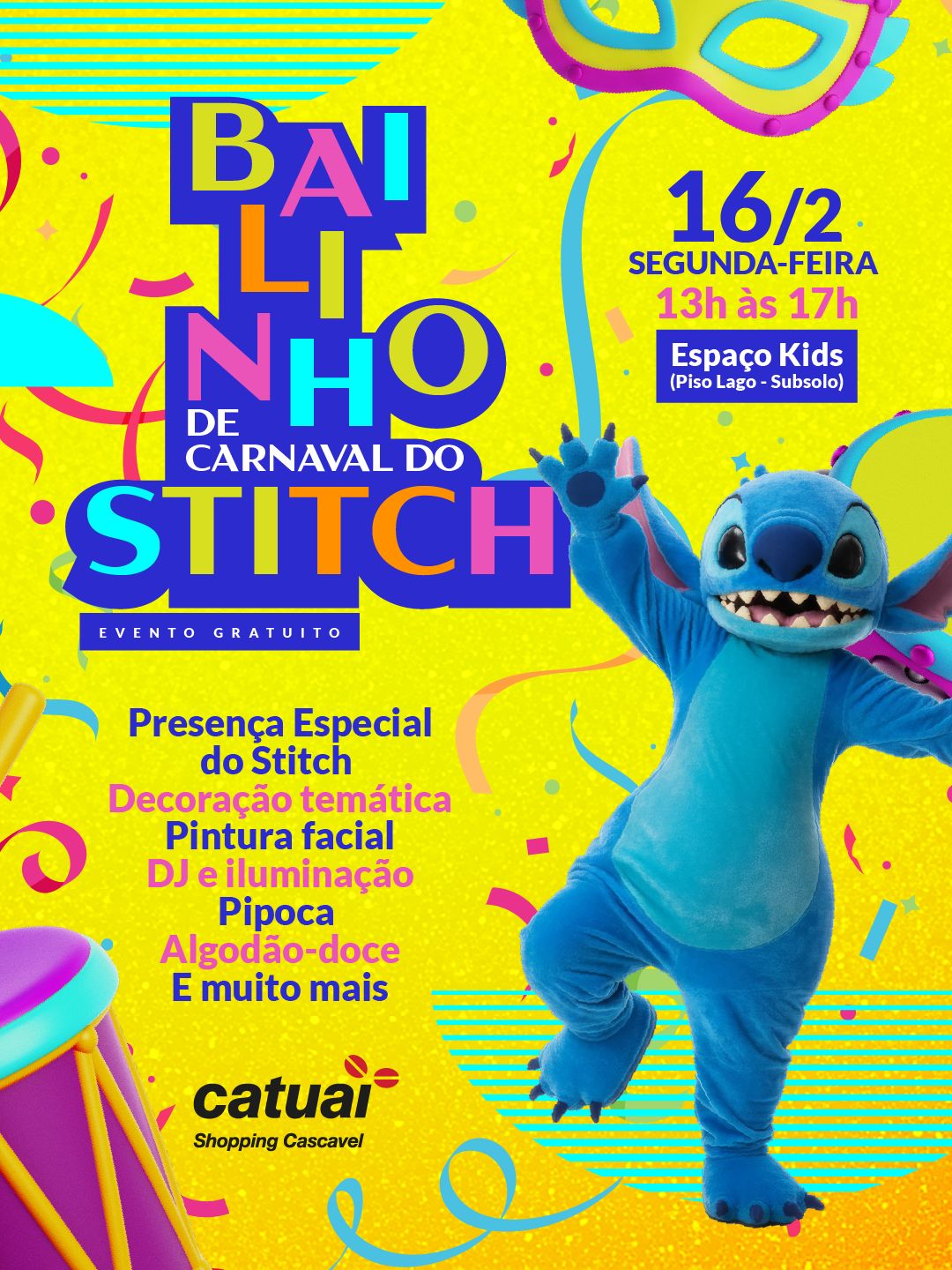 Na segunda-feira de Carnaval (16/02), das 13h às 17h , o Catuaí promove o Bailinho de Carnaval do Stitch, no Espaço Kids – Piso Lago (Subsolo). O evento conta com presença do personagem Stitch para fotos, pintura facial, DJ com música, decoração temática e distribuição de pipoca e algodão-doce, proporcionando uma tarde de entretenimento para crianças e famílias. Entrada gratuita.